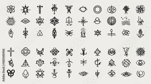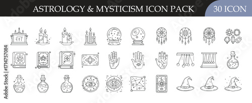 Set of outline icons featuring tarot cards, occult symbols, and spiritual elements