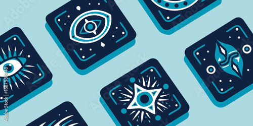 Tarot card set with mystic eye and celestial border. Boho esoteric tarot card with eye and frame. Vector illustration. Sacred geometry celestial triangle