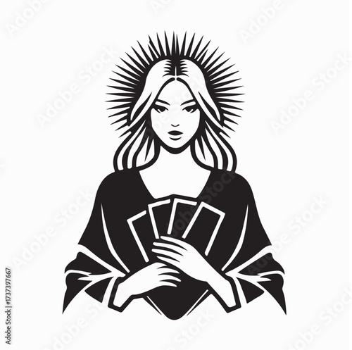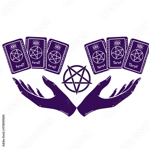 linear illustration of a female hand. witch's hand with tarot cards, magic divination ritual