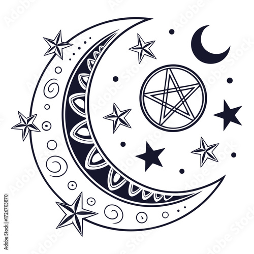 Mystical sun and half-moon filled with pattern, ornate crescent in tarot style, magic jewel, occult symbol, vector