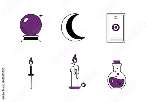 Mystic symbols set with crystal ball potion bottle tarot card phases candle flame vector icons for spiritual design