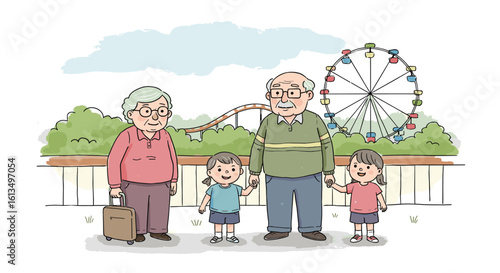 Grandparents spending time with grandchildren outdoors, playing, walking, relaxing on benches, and bonding in nature, family generation illustration