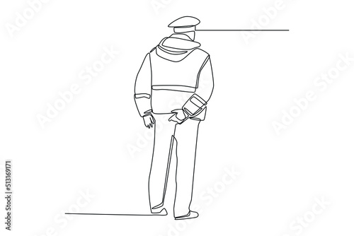 The drawing of a soldier of the British royal guard in a red uniform during the service. Drawing in color and simple line.