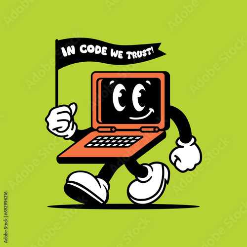 A cheerful, vintage cartoon-style laptop with a smiling face and limbs is depicted walking while holding a flag with the text "IN CODE WE TRUST!". Coding concept. Vector