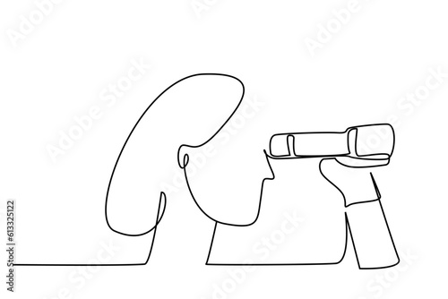 Continuous one line drawing of Young Man looking through with binocular. Single line drawing illustration of Male Enjoy looking for beauty. Finding concept vector art. Doodle line illustration.