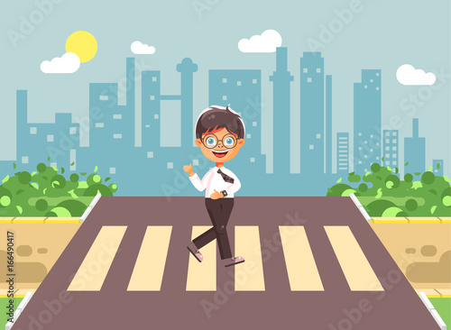 Vector illustration cartoon characters child, observance traffic rules, lonely brunette boy schoolchild, pupil go to road pedestrian crossing, on city background, back to school in flat style