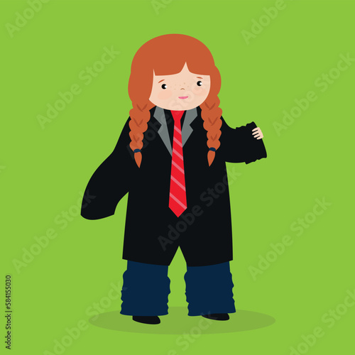 Cute little girl in oversize school uniform. Vector illustration in flat style
