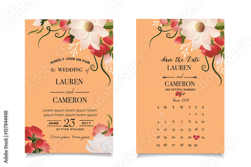 Orange watercolor wedding invitation design with beautiful flowers. Floral wallpaper