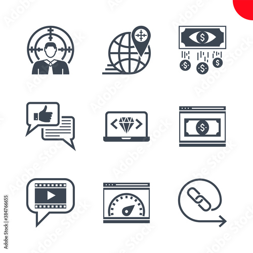 SEO Related Vector Glyph Icons Set. Target audience, video marketing, backlinks, landing page, clean code, perfomance, social engagement, cost per impression. Editable