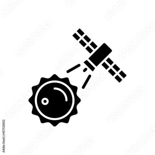 Sun observation process black glyph icon. Interstellar research mission. Heliophysics science investigation perfomance. Silhouette symbol on white space. Vector isolated illustration