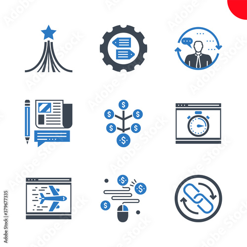 SEO Related Vector Glyph Icons Set. Pay per click, press relise, return on investment, landing page, backlinks, perfomance, consulting, strategy for victory, seo tag optimization.