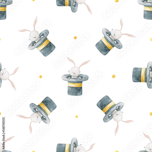 seamless, endless pattern with circus. Funny characters, trained animals on transport, jumping show, perfomance. Children's illustration, textile design, print on white background