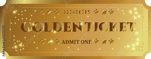 Golden ticket template for entry. Vector cinema ticket mockup (tear-off) with starry golden background. Useful for any festival, party, concert, cinema, birthday, entertainment show