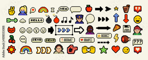Set of 3d pixel art icons of emoji, arrow, cloud, eye, heart, email. Pack of pixelated emoji icons. 8-bit retro vector illustration of emoticons.