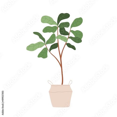 Ficus lyrata, potted house plant growing in basket. Fiddle-leaf fig in planter. Green home tree in flowerpot. Natural interior decoration. Flat vector illustration isolated on white background