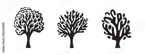 Whimsical forest tree design collection vector organic style. Monochrome woodlandarbor for outdoor quirky linocut set.
