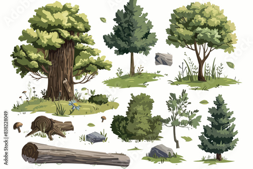 Summer trees, bush, grass. Set of green plants. Elements for vector flat design. Landscape. Nature