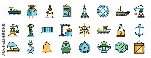 Marine port icons set. Outline set of marine port vector icons thin line color flat on white