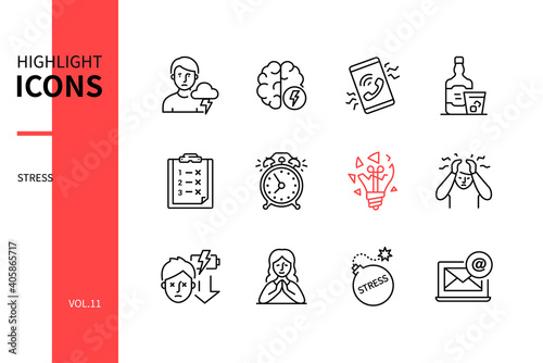 Disaster Trauma Icons. Line style icons of disaster psychology and trauma support: stress management guide, psychological first
