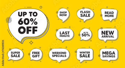 Up to 60 percent off sale. Speech bubbles with 3d bell, megaphone. Discount offer price sign. Special offer symbol. Save 60 percentages. Discount tag chat speech message. Red offer talk box. Vector