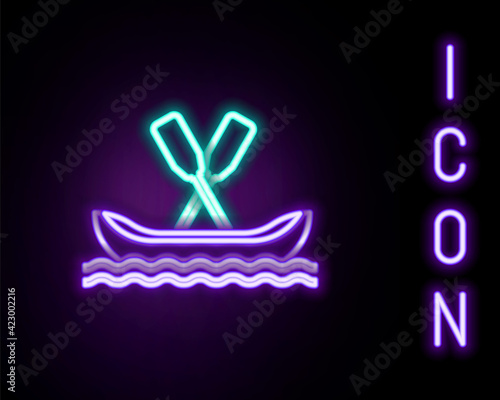 Glowing neon line Rafting boat icon isolated on black background. Inflatable boat with paddles. Water sports, extreme sports, holiday, vacation. Colorful outline concept. Vector