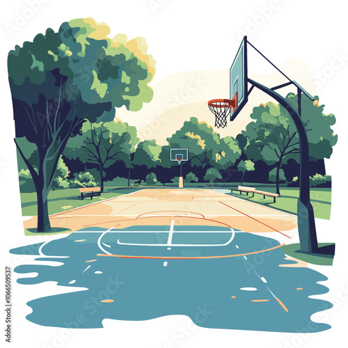 Isometric basketball court in the park with benches and trees. Vector illustration.