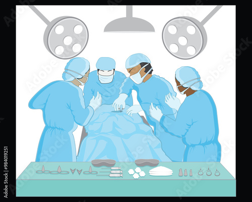 vector illustration design of several people consisting of a nurse and a surgeon performing a surgical operation in light blue uniforms and surgical equipment under lights in the operating room