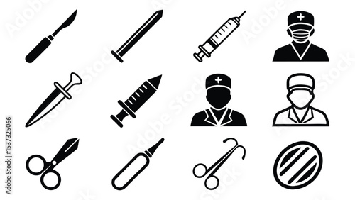 Black and white medical icons featuring surgical instruments and healthcare professionals