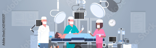 mix race surgeons team surrounding patient lying on operation table during surgery medical workers in operation room modern hospital clinic interior horizontal portrait