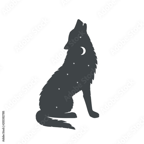 Vector logo design illustration of a wolf howling in a night full of stars.