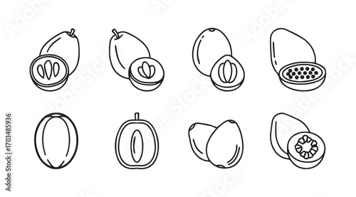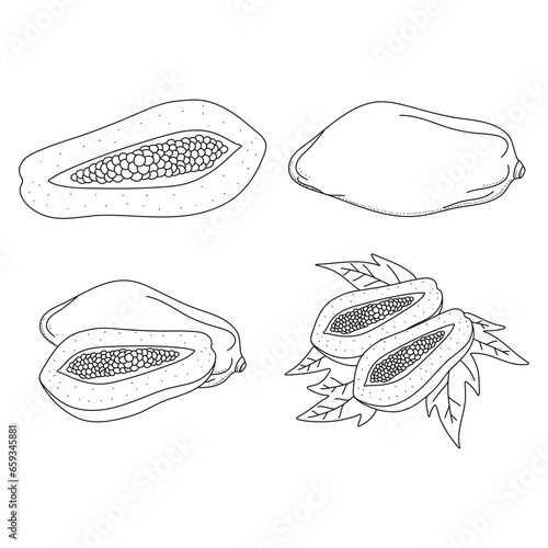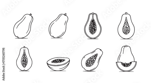 Collection of papaya fruit illustrations showing whole and halved pieces silhouette