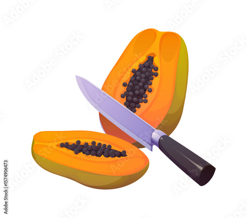 Cartoon ripe papaya fruit cut in half with black seeds inside, cooking process. Vector Juicy tropical fruit sliced by sharp kitchen knife. Fresh and ripe healthy food, summer ingredient preparation