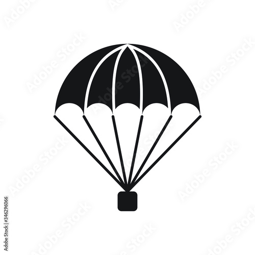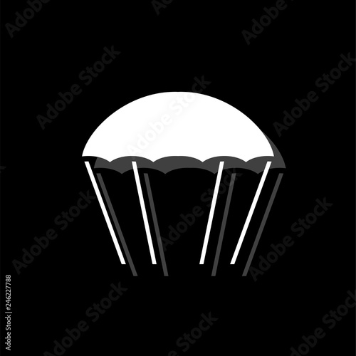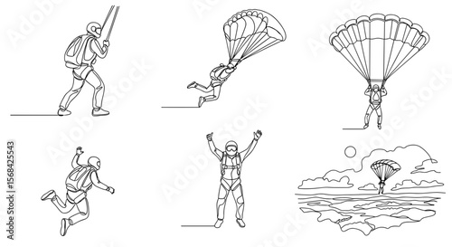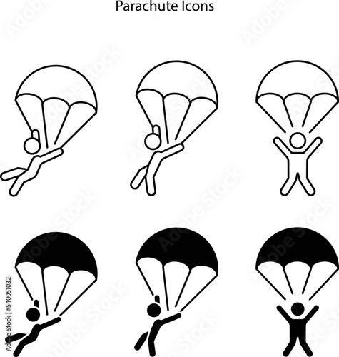 Parachute icons on white background. Skydiving during flight and landing with an unfolded parachute.. Extreme sport and entertainment.