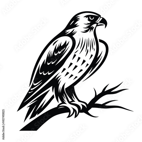 Detailed Black and White Stylized Hawk Resting on a Branch Perched up