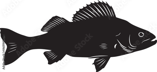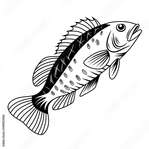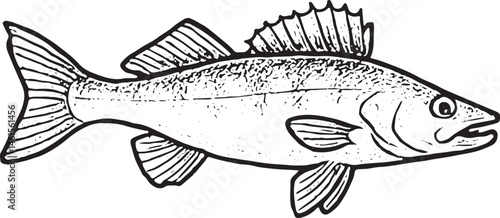 Pike perch fish illustration with detailed lines and bold patterns in black and white