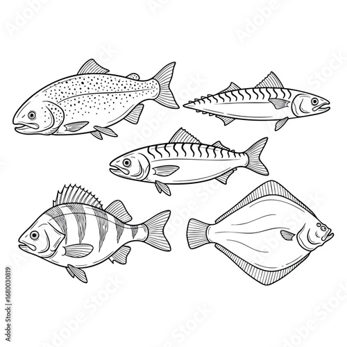 Handdrawn black and white illustration set of various fish species including trout mackerel perch and flounder.