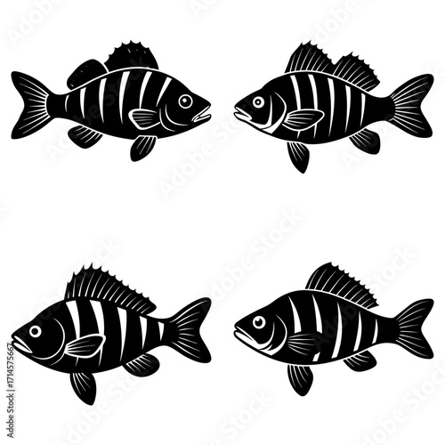 Four black and white perch fish swimming in different directions with detailed fins and striped bodies