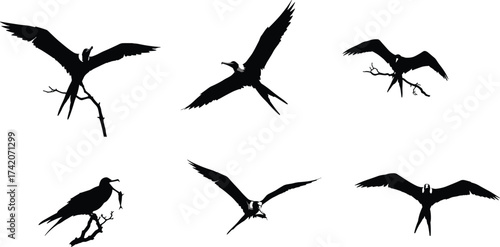 Frigatebird silhouettes in flight, perched, with fish and inflated throat pouch, tropical seabird vector set for wildlife and nature themes