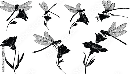 Seven Dragonfly Silhouettes Hovering and Perching on Flowers in Black and White Vector Style for Nature, Garden, Insect, and Art Design