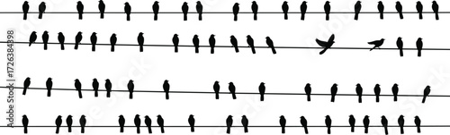 Bird silhouettes perched on electric wires, black songbird shadow vector illustration, flock of birds sitting together, wildlife artwork isolated background