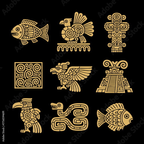 A set of tribal symbols. American style. Aztec animals style Mexican designs