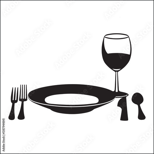 Vector Art of  a Simple Black and White Line Art: Fork, Knife, and Plate Place Setting Icons