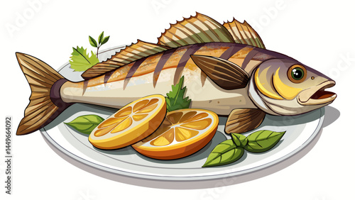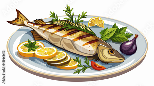 illustration A gourmet dish of grilled fish and rose wine at a restaurant.