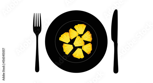 Artistic presentation of pineapple slices on a black plate with cutlery on a transparent background with copy space