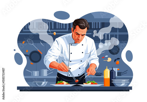 Chef plating a sophisticated dish with artful precision in a min