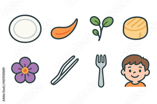 Playful Gourmet Illustrations. Flat vector mini-illustrations fine dining plating in colors children's illustrations: porcelain