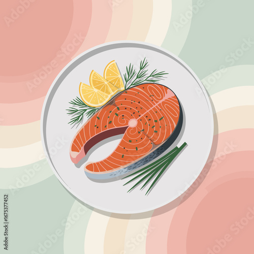 Salmon steak with fresh dill and lemon wedges presentation on a plate overhead shot for healthy eating concept illustration