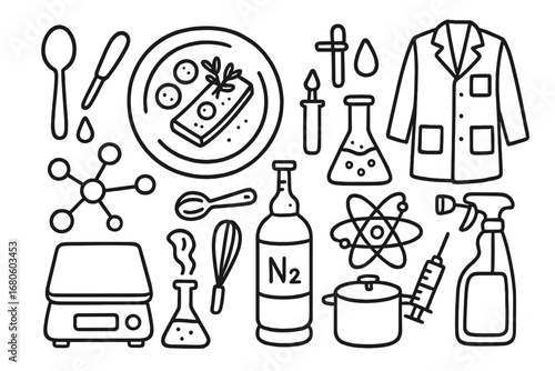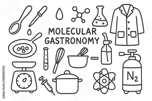 Molecular Gastronomy Icons. Hand-drawn doodle illustration Molecular gastronomy plating plate, spoon, pipette, droplet, molecular