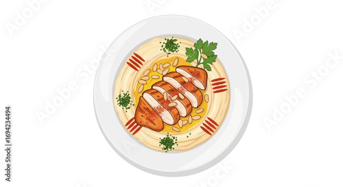 Artistic rendition of hummus with sliced chicken and pine nuts plating