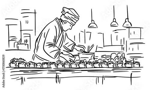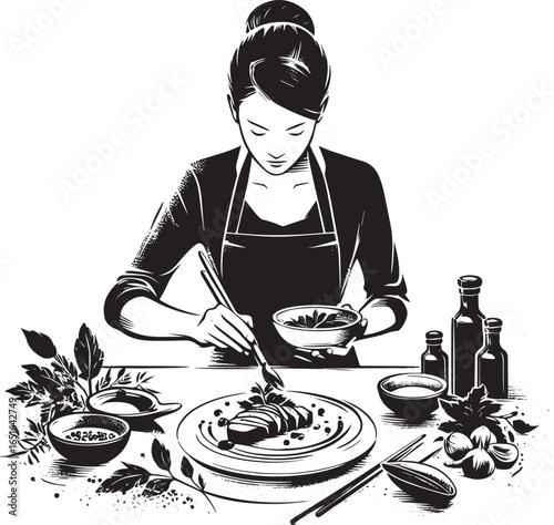 Chef plating food gourmet cuisine culinary art single line drawing